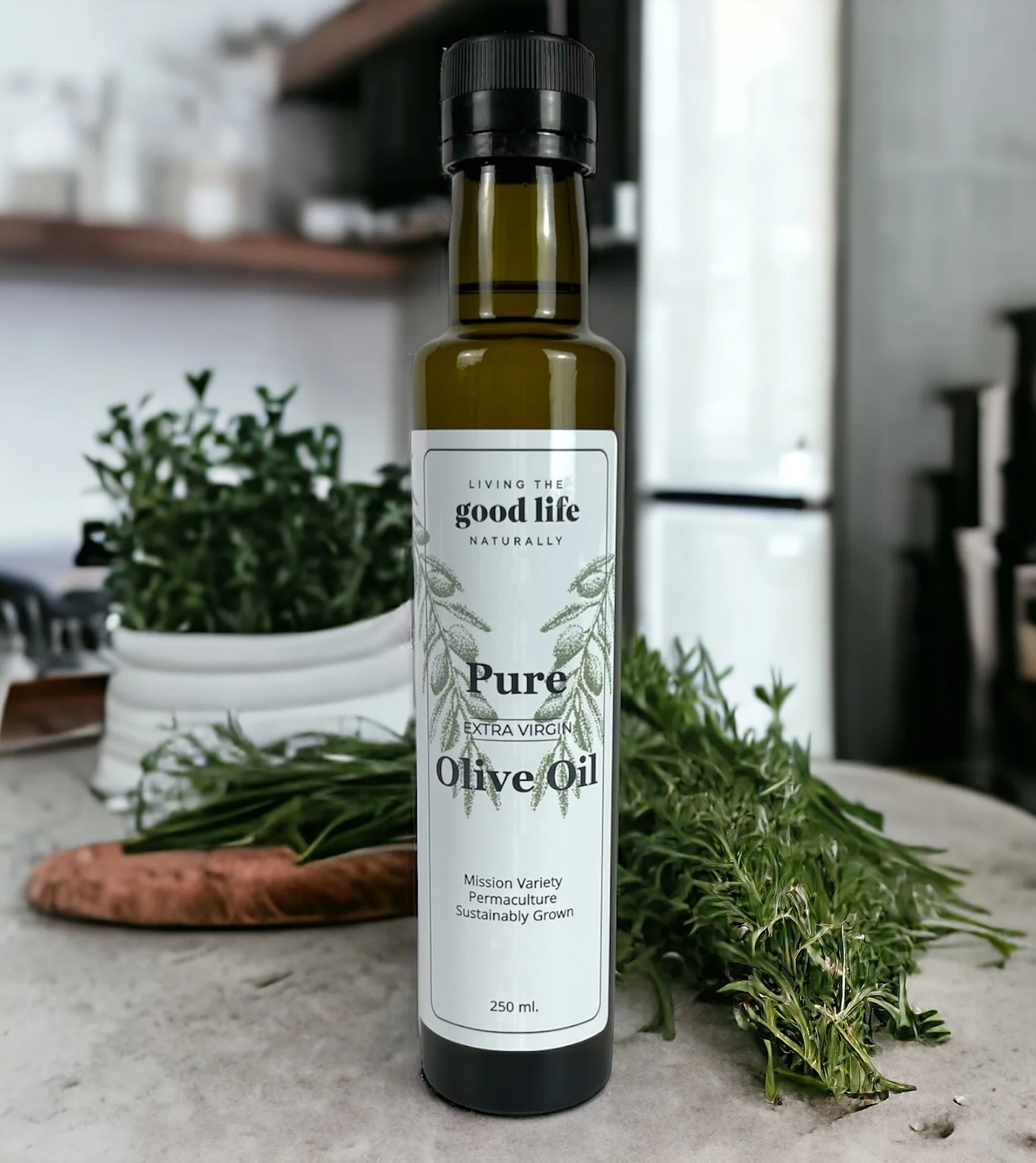 Experience the exceptional taste of Living the Good Life Naturally's extra virgin olive oil, a premium cold-pressed EVOO crafted from century-old California mission-variety olives grown using sustainable permaculture principles.
